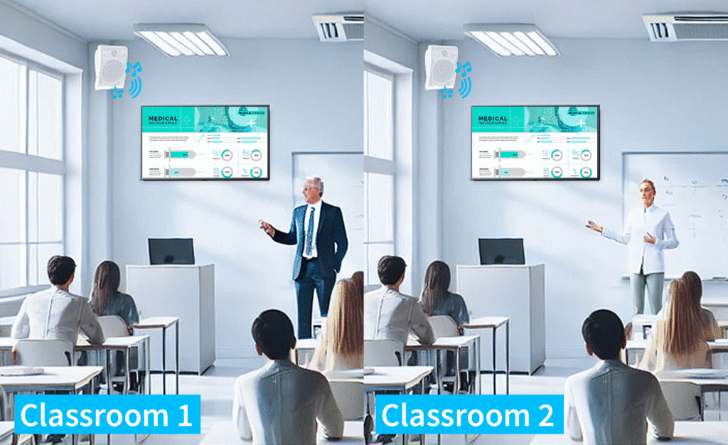 Live PA announcements. Also prerecorded, time scheduled audio message, tone, alarm and bell distribution.